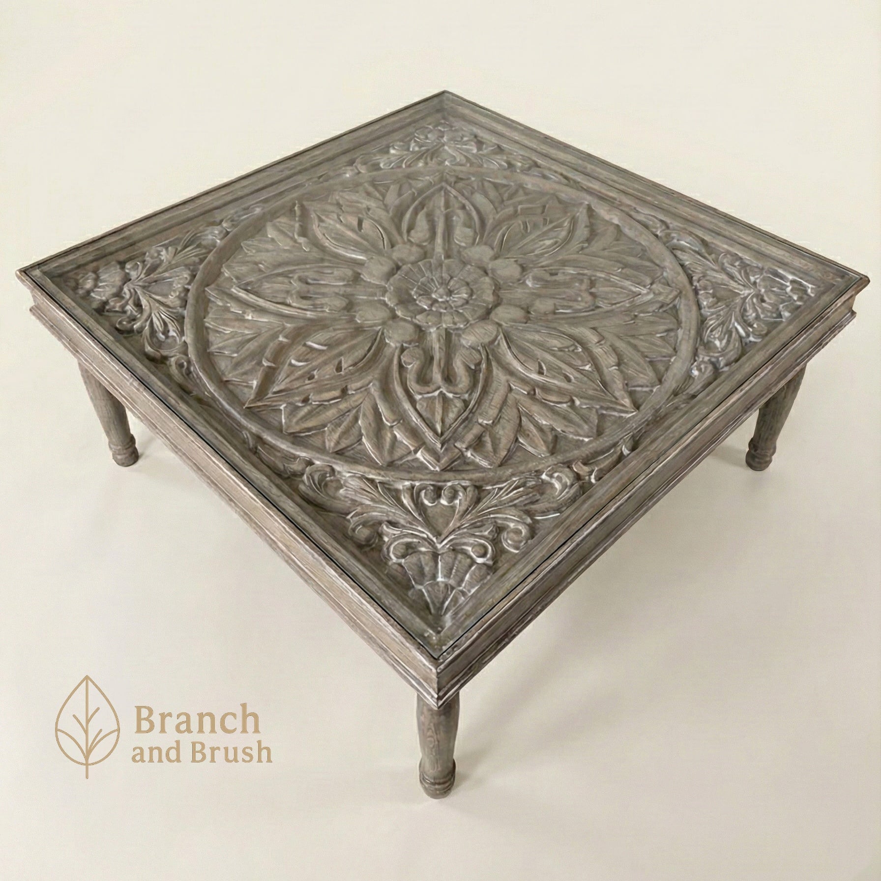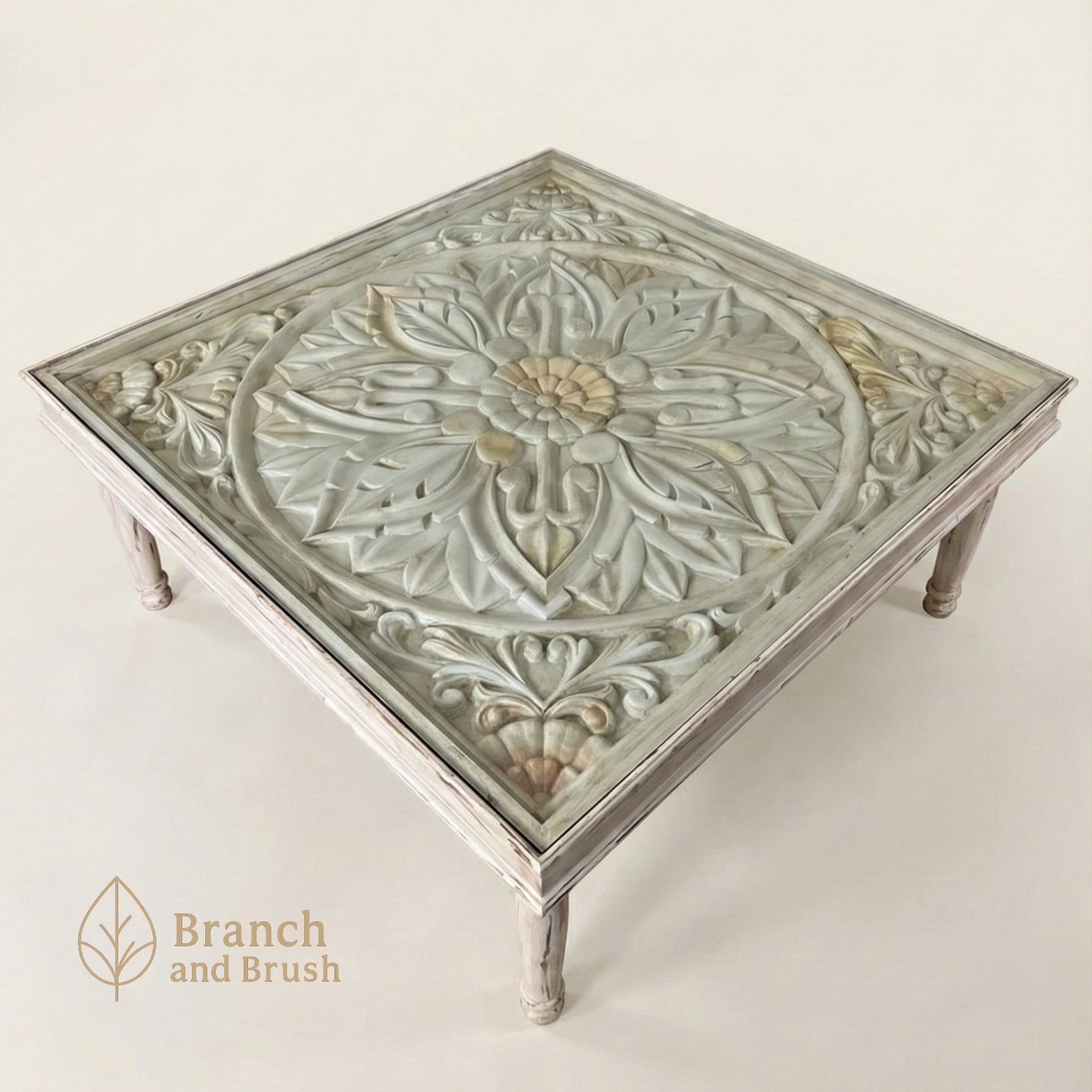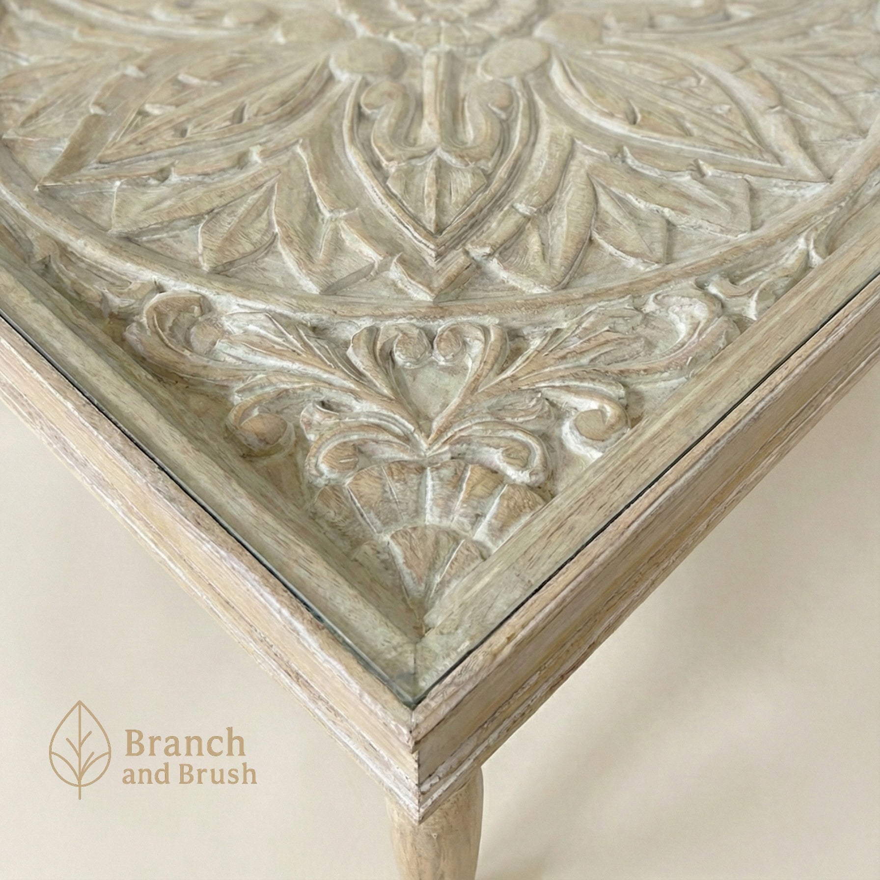 The Luna Carved Coffee Table blends a sculpted floral panel with a clean, classic profile. The frame is solid beech wood; the top features carved MDF sealed beneath clear tempered glass for daily use. Finished by hand to highlight texture and depth, Luna anchors the room with quiet elegance.