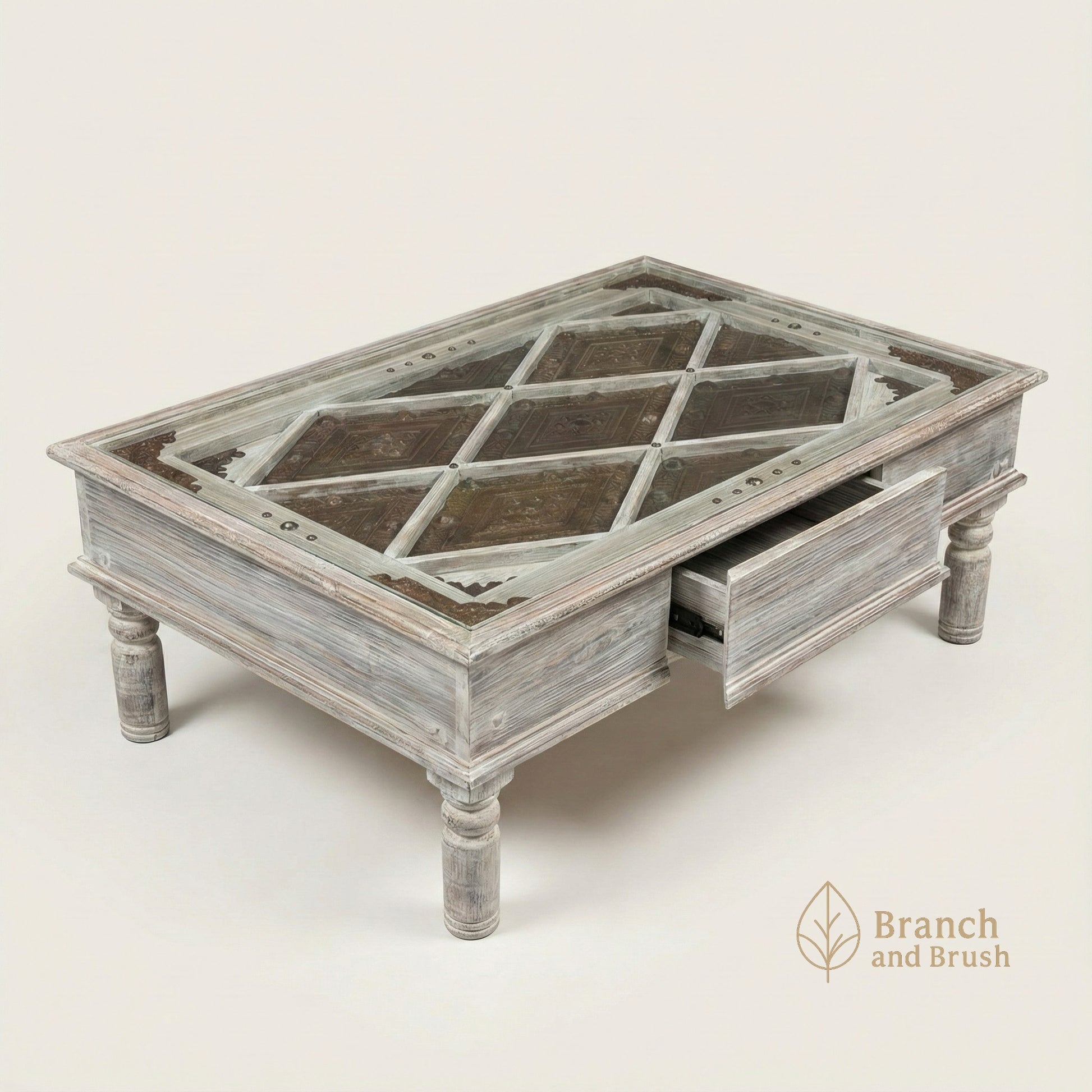 Hand-distressed finishes give each table a vintage, collected feel. A hidden drawer adds functional storage, making this a perfect centerpiece for living rooms, majlis spaces, and boutique interiors.