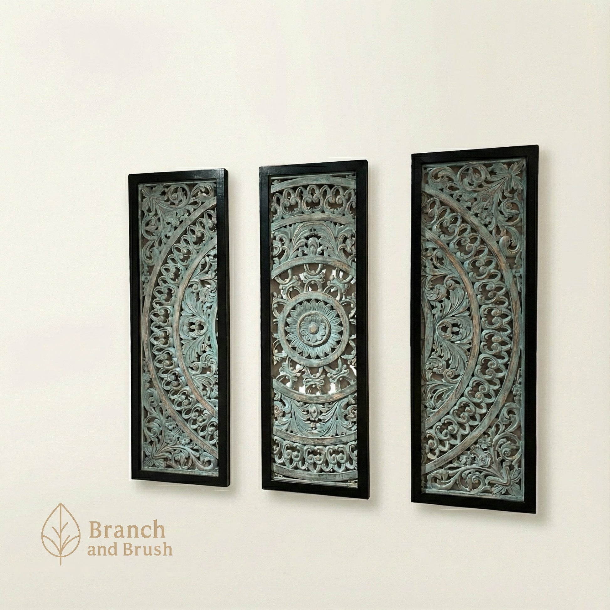 The Celeste Carved Wall Trio transforms any wall into a gallery of intricate artistry. This three-piece set features elaborate, hand-carved floral and geometric mandala patterns that flow seamlessly from one panel to the next, creating a unified and mesmerizing visual experience.